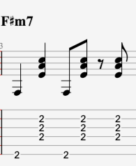Here we’ll alternate from an F#m7 chord to a C#m7 chord three times spending 1 bar on each chord like this: