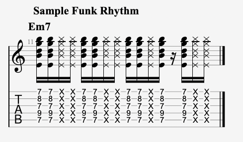 Here’s an example of a strumming pattern in the style of “Another One Bites The Dust”: