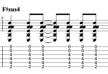 The F#sus4 chord is built by replacing the A (in an F# minor chord) with a B, creating a suspended feel. The tension in a suspended chord often resolves to a major or minor chord.