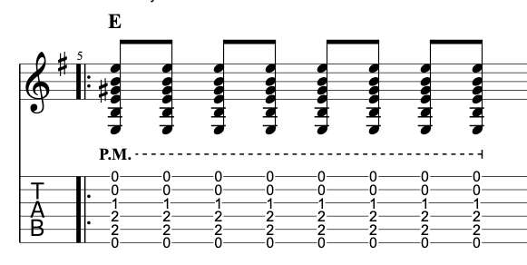 Em changes just one note from the previous E chord above. It lowers the G# down to G with the open 3rd string like this: