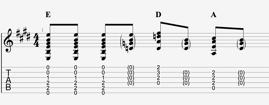 Function: This is the IV chord (subdominant) in the key of E major. It creates contrast and a sense of forward motion, often used to prepare for the dominant chord (B or B7), or resolve back to the tonic (E). The I–IV–V movement is foundational in blues, rock, and pop.