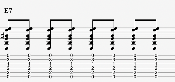 E7 is played using all 6 strings in open position like so:
