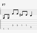 This can then be moved around the neck for the other chords in a blues. So for example here is the same pattern over an F7 chord: