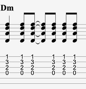 This gives a strong and consistent forward motion to the tune. However, if I were to strum this song I would not play all 8th notes continuously. Instead I would mix a combination of 8th notes, quarters notes, and ties like this: