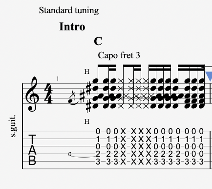 However, the main acoustic guitar uses a capo on the 3rd fret, which changes the strings to read: