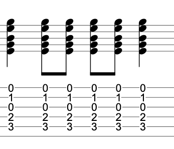 This is the main rhythm and can be played throughout. However, I often don’t play all the 8th notes. Instead, I would use a combination of 1/4 notes and 8th-notes like this: