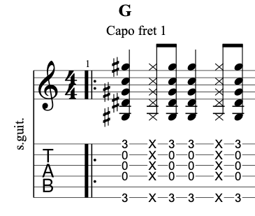 However, it’s played with a capo on the 1st fret, which changes the notes to read: