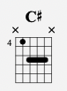 Finally, we have C#, which is played the same way as B major, it’s just shifted up 2 frets like this: