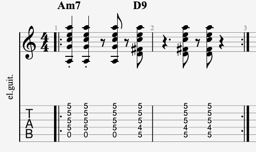 To play “Oye Como Va”, as recorded by Carlos Santana, you only need to know two chords they are Am7 and D9. Let’s take a look at a few ways these chords can be played on the fretboard.
