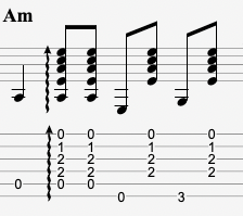 This gives a strong and consistent forward motion to the tune. Here’s an example of a “Runaway”style strumming pattern that blends both quarter notes and 8th notes: