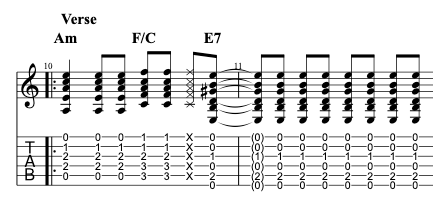 However, I don’t strum all 8th notes. Here’s an example of a “Smooth” style strumming pattern demonstrating different rhythms: