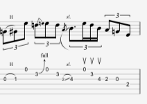 Another secret trick that Vaughan does throughout is an upstroke rake. Essentially what he is doing is dragging his pick through strings 1, 2, and 3 in all upstrokes. You’ll see this raking technique in the previous lick as well as in this one: