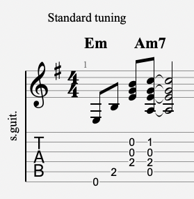 Em is a beautiful open-sounding chord. It uses all 6 strings like this: