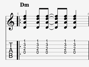However, the guitar rhythm doesn’t just play all 8th notes. Here’s an example of a rhythm pattern in the style of “Sunny Afternoon”: