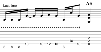 The guitar style blends a 16th-note rhythm with some palm muting and a blues rhythm pattern. Here’s an example of a rhythm pattern in the style of “Walk This Way”: