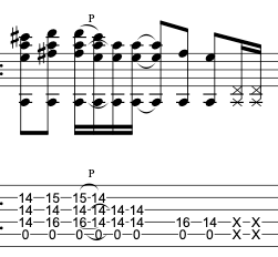 However, May also brings in some sixteenth notes as well. Here's an example of a strumming pattern in the style of “We Will Rock You”: